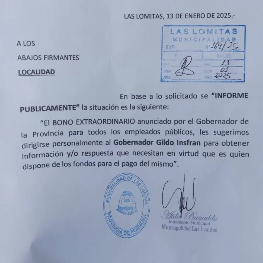 “En base a lo solicitado de informe públicamente, la situación es la siguiente: el bono extraordinario anunciado por el Gobernador de la provincia para todos los empleados públicos. Les sugerimos dirigirse personalmente al gobernador Gildo Insfrán para obtener información y/o respuesta que necesitan, en virtud de que es quien dispone de los fondos para el pago del mismo”, dice la nota de respuesta oficial, firmada por Basualdo.