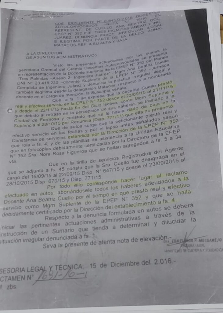Después de casi una década de lucha y obstáculos burocráticos, el Superior Tribunal de Justicia de Formosa ordenó al Ministerio de Educación que, en un plazo de 30 días hábiles, reconstruya y resuelva el expediente de la docente Ana Beatriz, quien fue víctima de la falsificación de su firma en 2015.