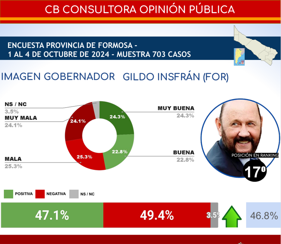 El gobernador de Formosa, Gildo Insfrán, se ubicó en el puesto 17 del ranking interprovincial de imagen positiva con un 46.8% de aprobación, de acuerdo a el informe de CB Consultora Opinión Pública, publicado en octubre de 2024.